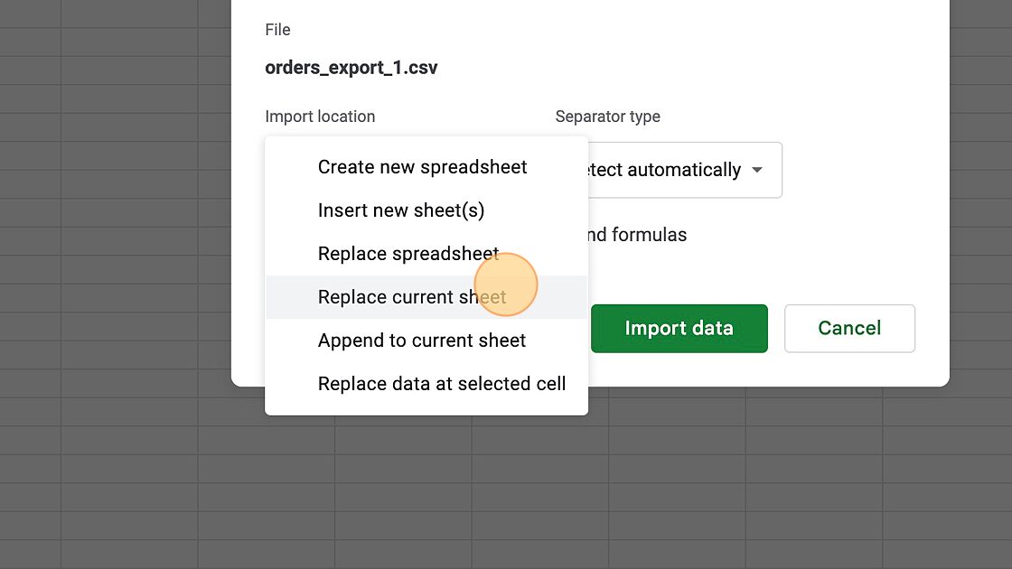 7. Return to the template, select the "Shopify Raw Data" tab and go to "File" and then "Import" and upload the CSV file.
