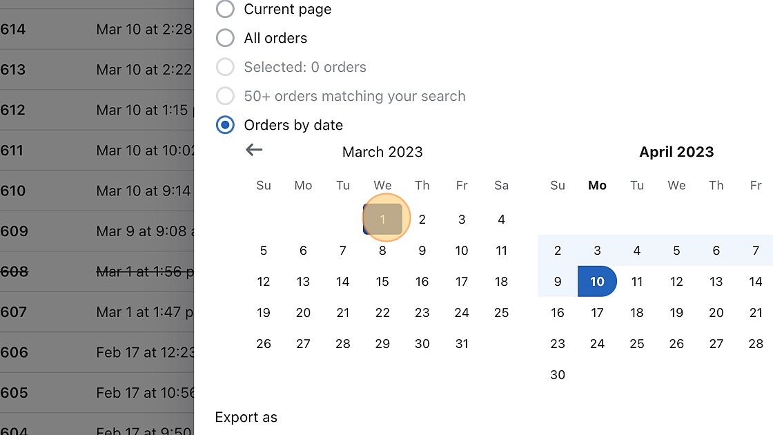 5. Export your orders from Shopify by selecting "Export" and then "Orders by Date" and selecting a date range that doesn't include yesterday's data. Click "Export".