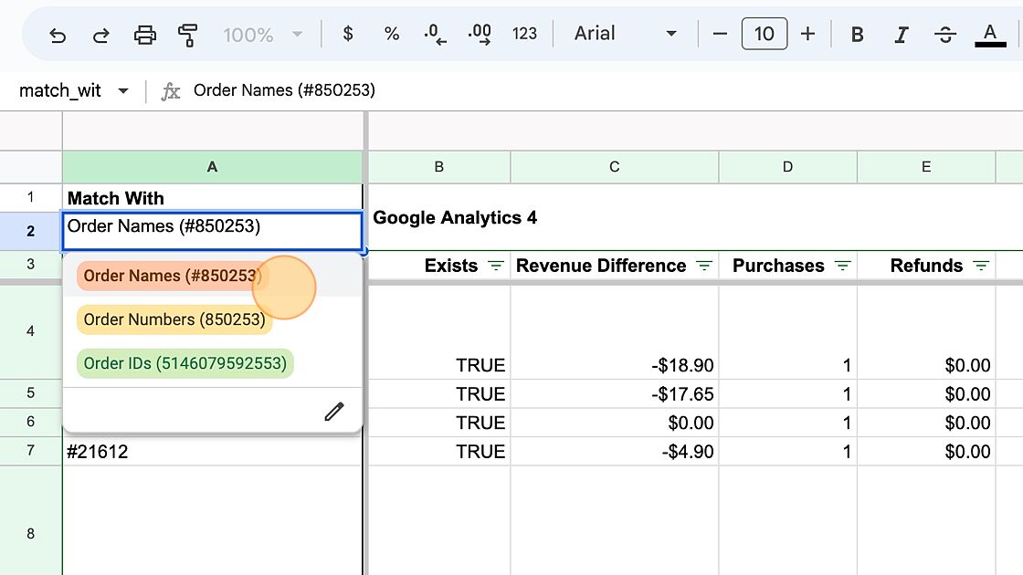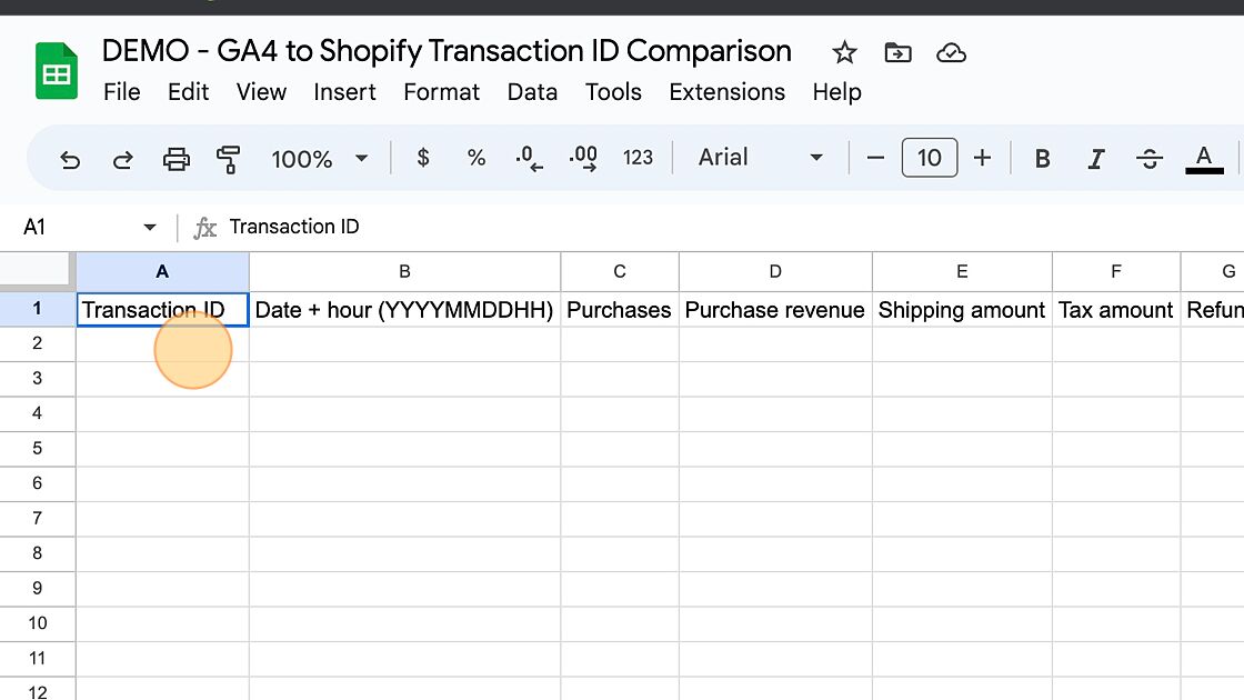 The spreadsheet compares order ids in Shopify to transaction ids in Google Analytics 4. By comparing each order individually, you can pinpoint exactly what’s causing any discrepancies. With it, you’ll find: