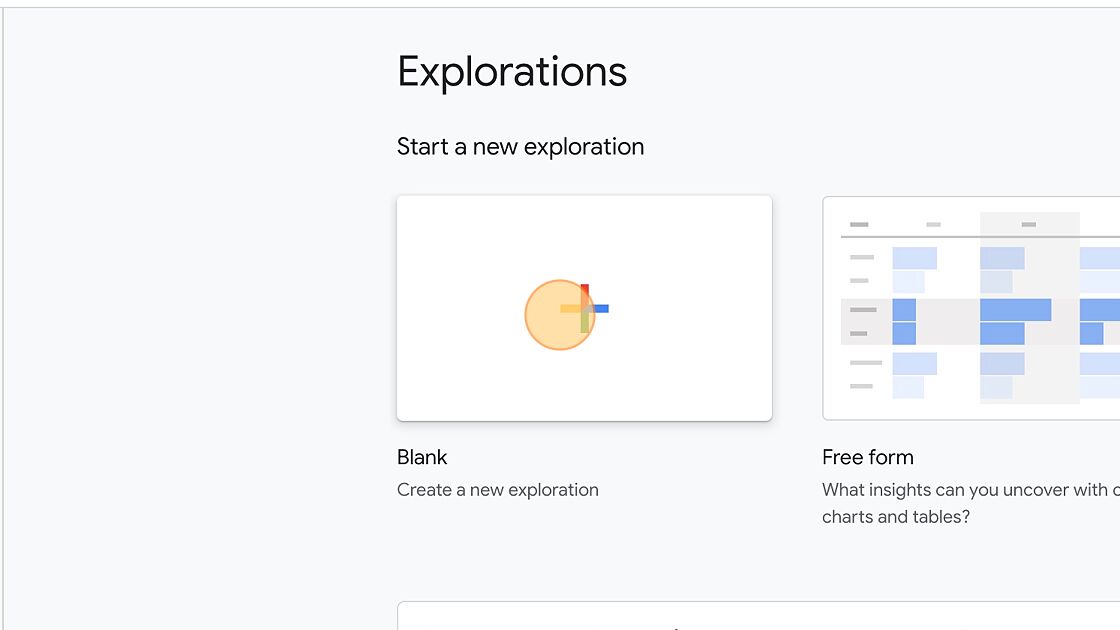 9. Create a report in Google Analytics 4 by logging in, selecting the account you want to use, and going to "Explorations." Create a blank Exploration.