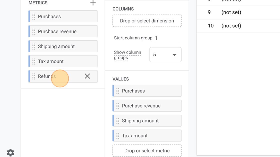 11. Import the "Purchases", "Purchase Revenue", "Shipping Amount", "Tax Amount", and "Refunds" metrics into the palette.