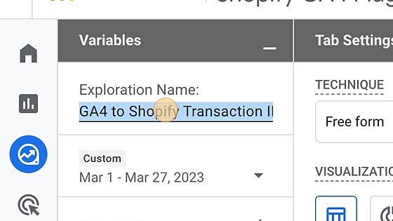 15. Name the Exploration "GA4 to Shopify Transaction ID Comparison" so you can easily reuse it.
