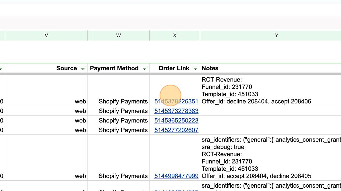 22. Scroll to the right to see info about the orders from Shopify to help determine what might be causing discrepancies. Click on the "Order Link" cell to open the actual order in Shopify.
