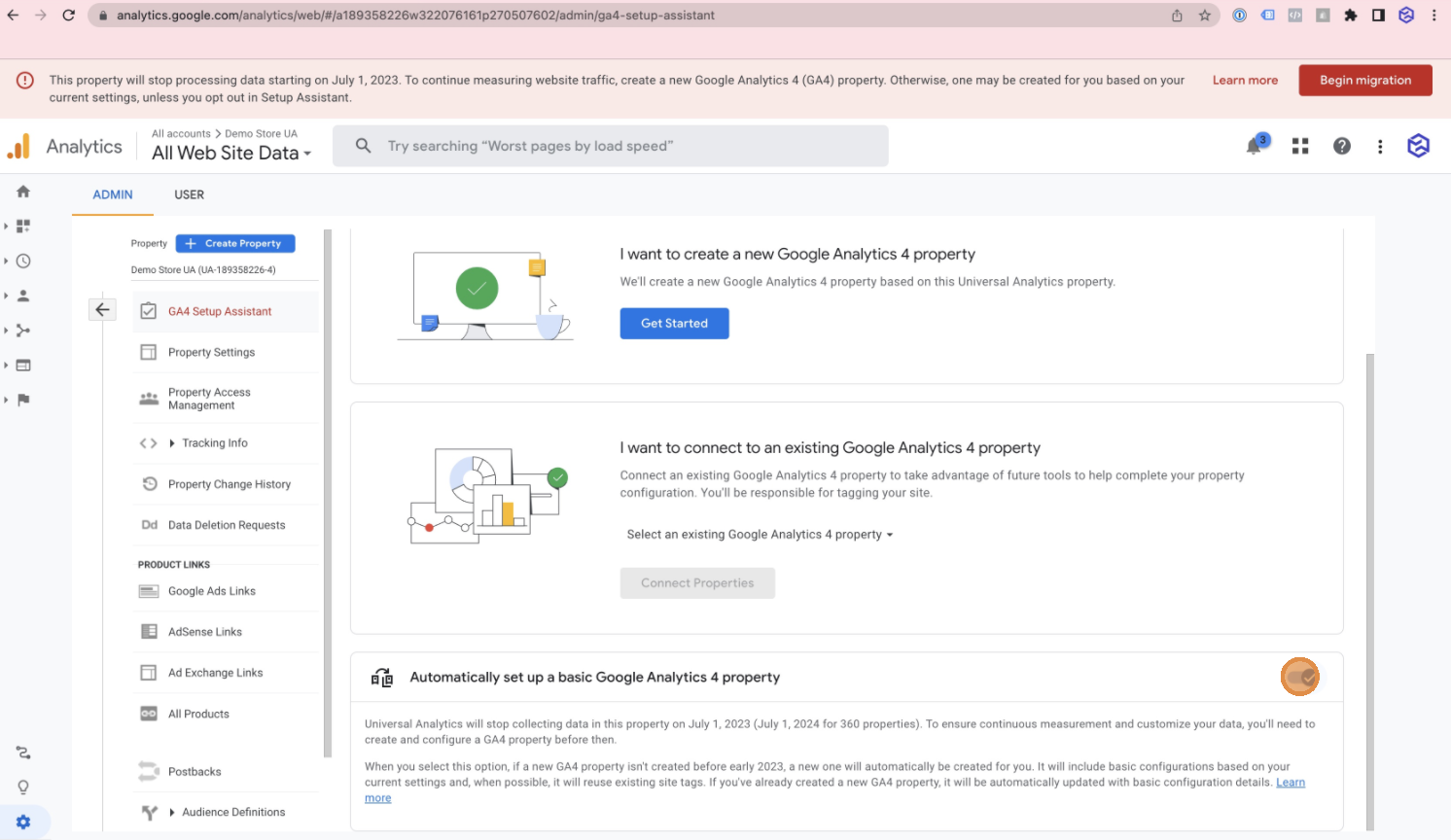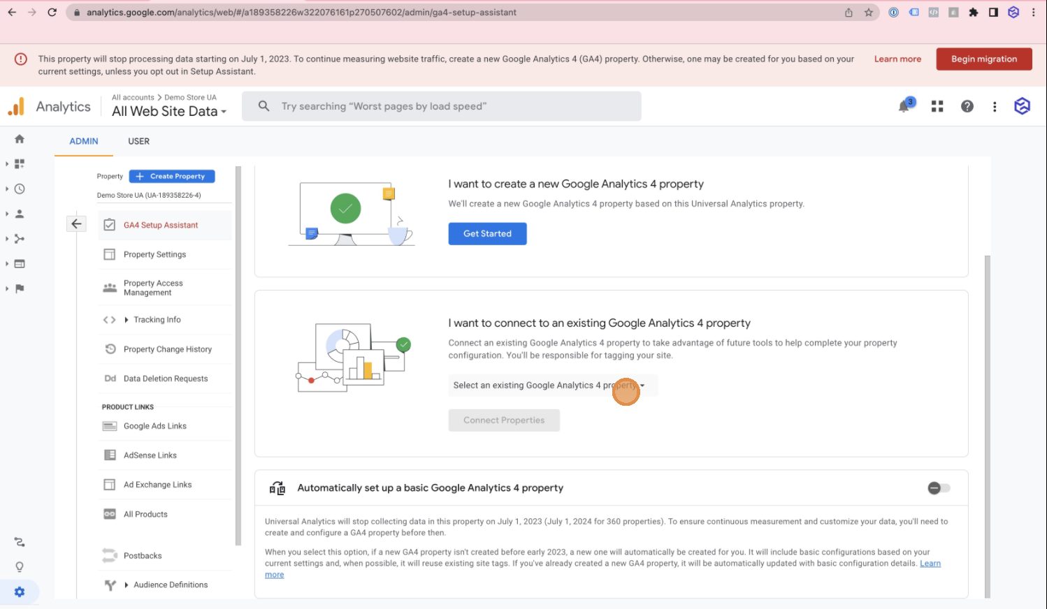 If your Universal Analytics property is already connected to GA4 property, disconnect it.