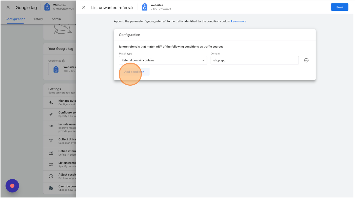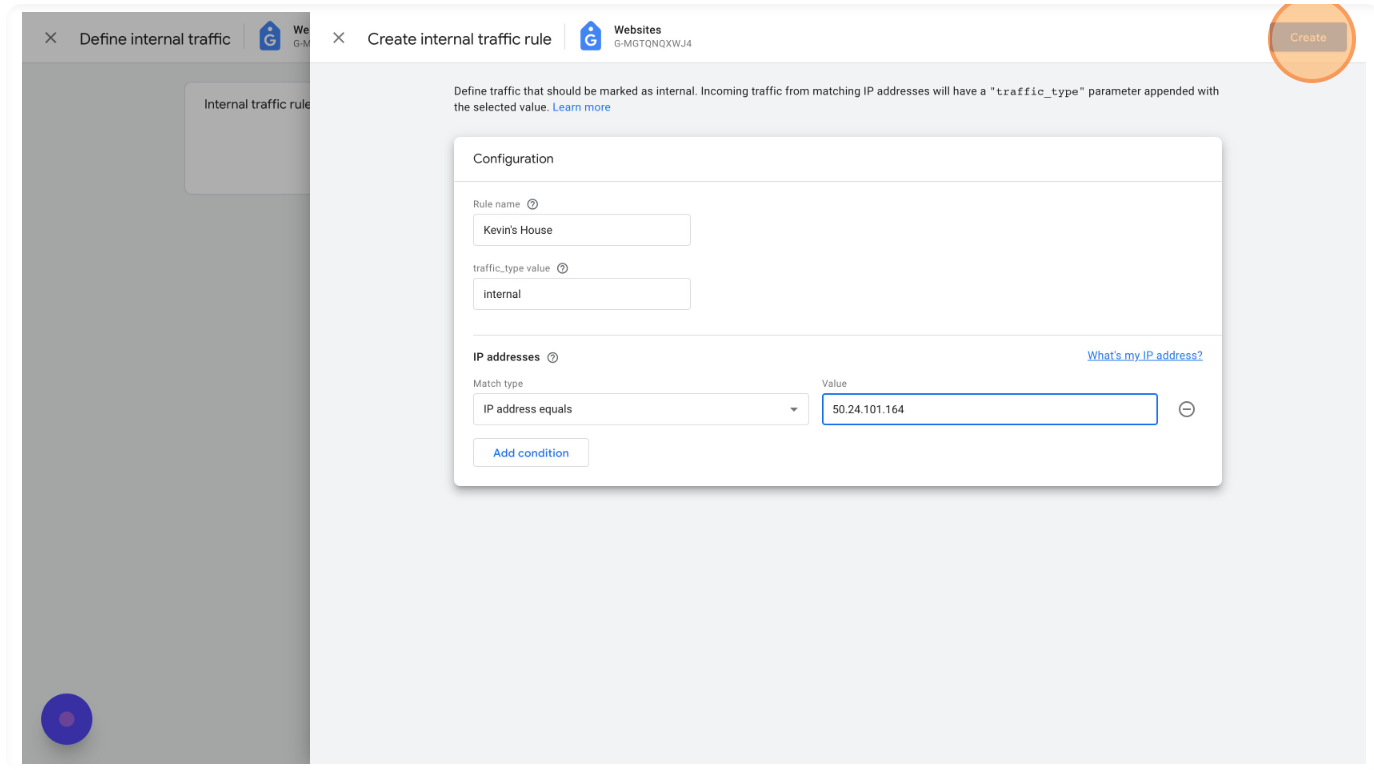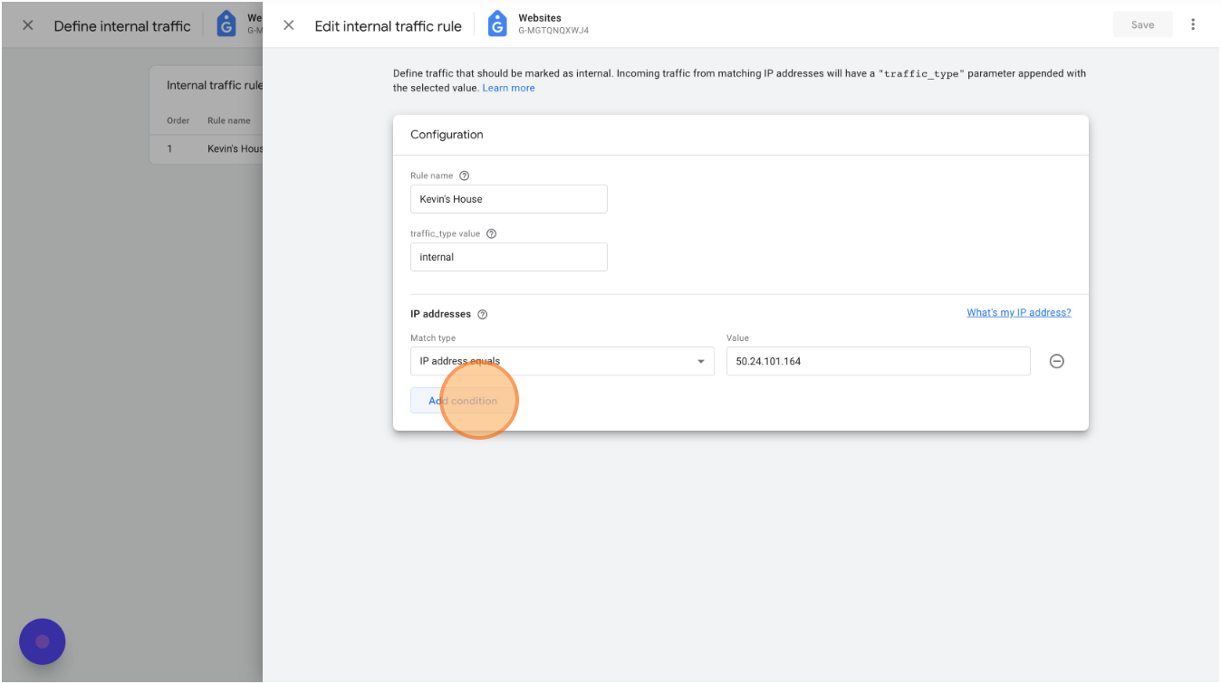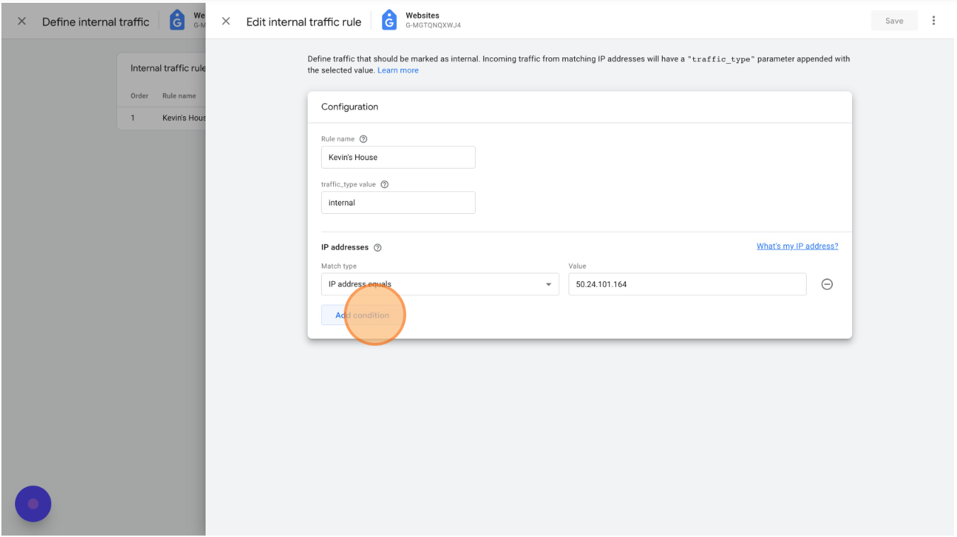 Click "Add condition" to add other IP addresses as needed. If you have IP filters defined in Universal Analytics (under Views > Filters) you can copy them all over here.