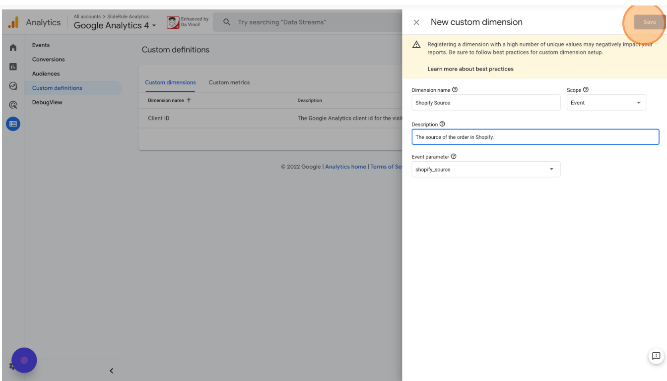 Click "Create custom dimension" again, add the Shopify Source information, and click "Save"