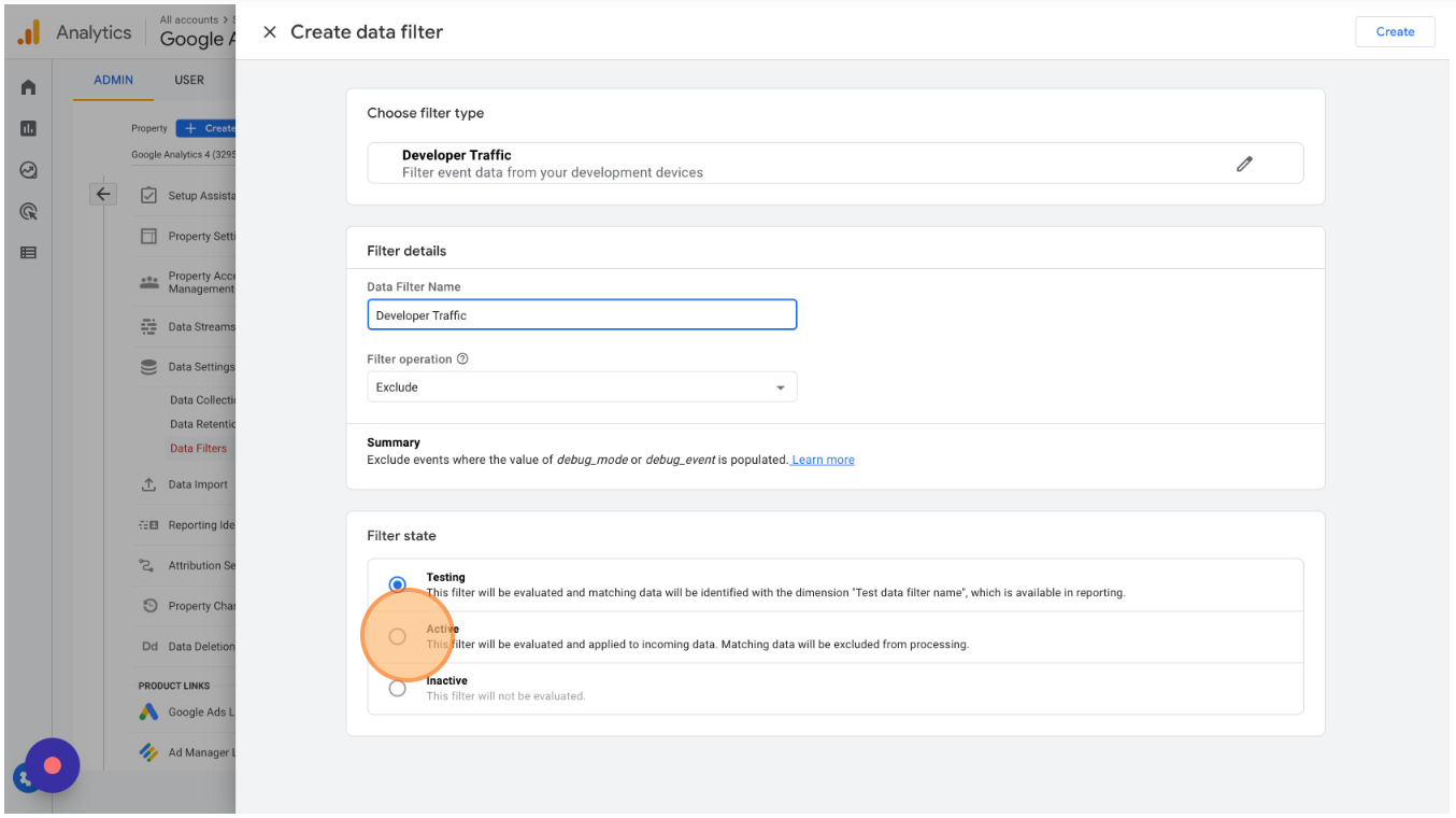 Name the filter "Developer Traffic", set it to "Active", click "Create", and Activate the filter.