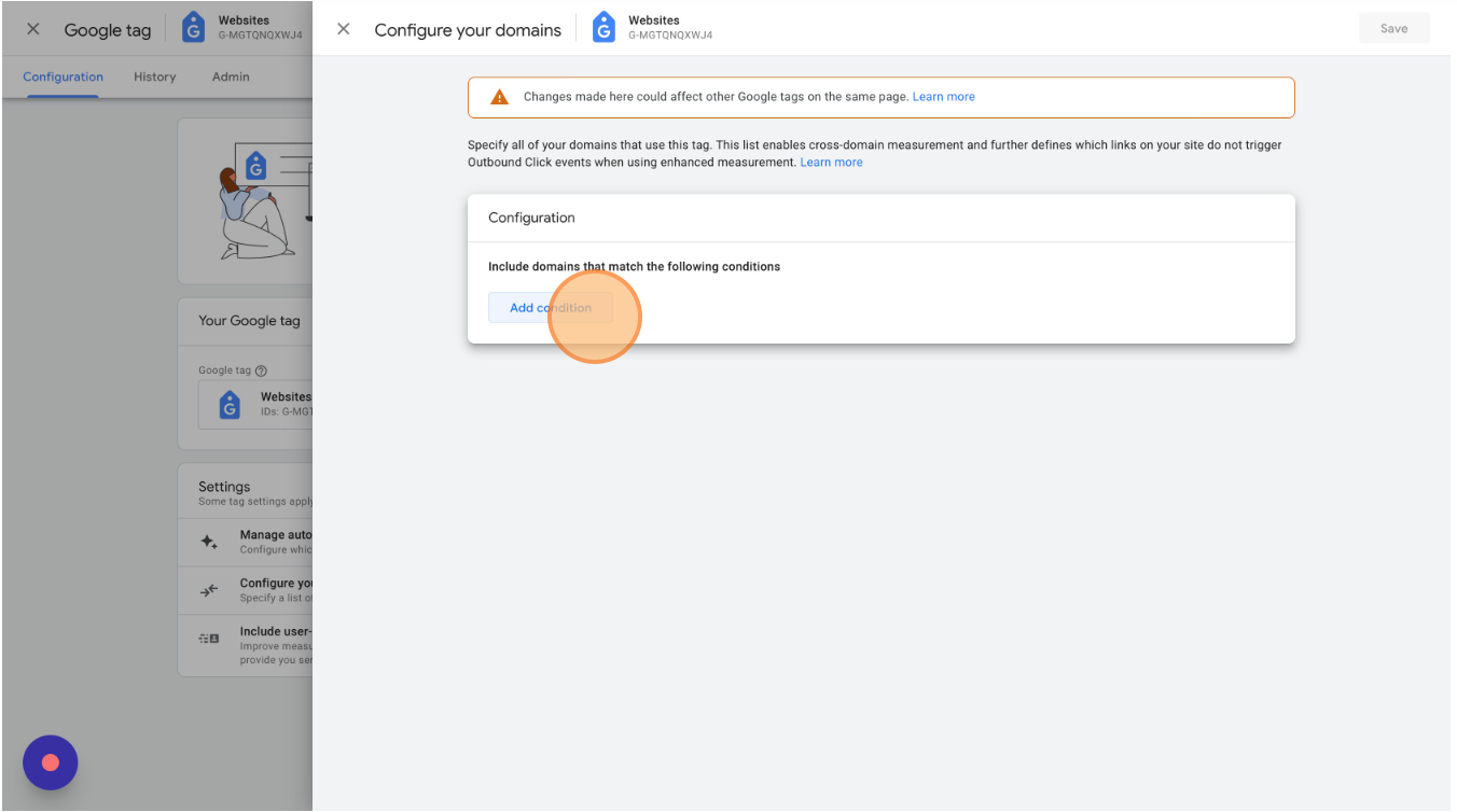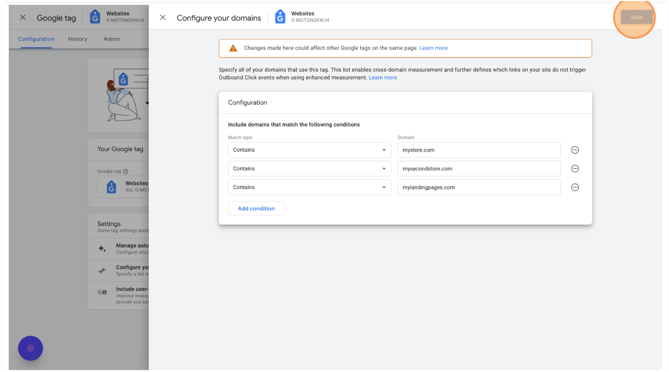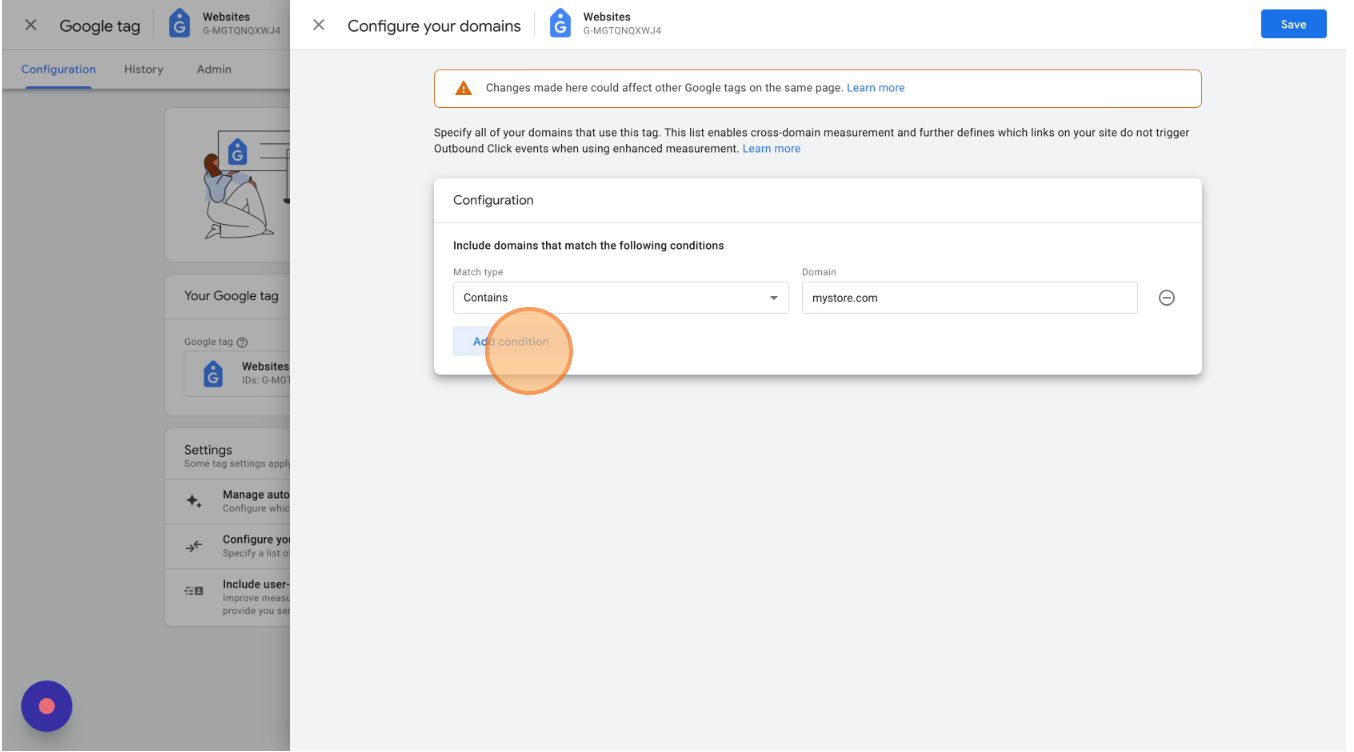 Enter your store's domain and add a new condition for each domain that sends data to this Google Analytics 4 property. You only need to add separate root domains (myfirststore.com & mysecondstore.com), not subdomains (first.mystore.com & second.mystore.com).