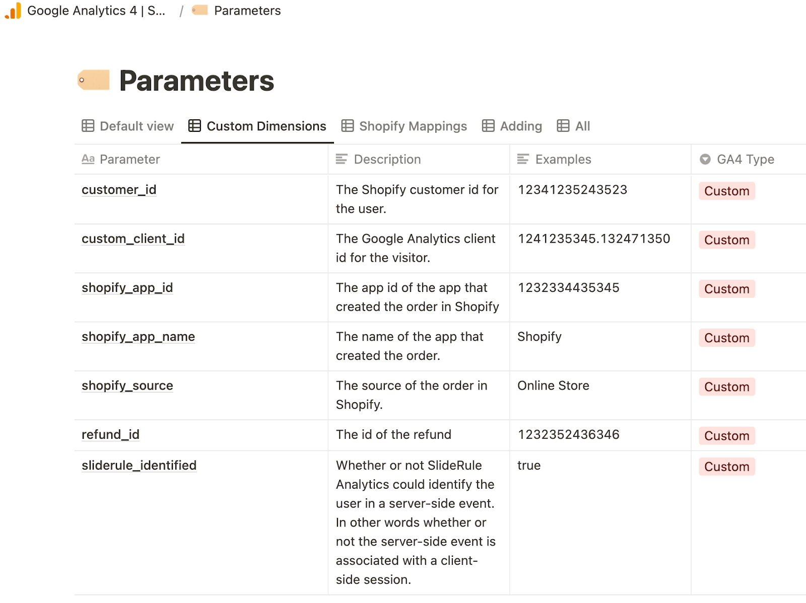 The SlideRule Google Analytics 4 app sends several, useful dimensions from Shopify to Google Analytics that aren't part of the standard GA4 ecommerce spec. If you’re using Google Tag Manager, you may also be sending additional dimensions.