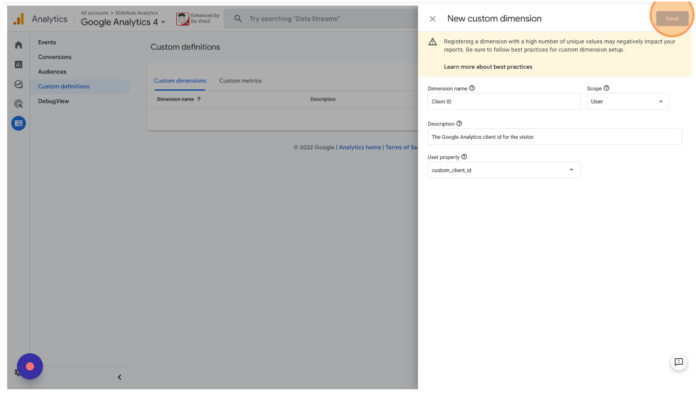 Enter the Dimension name as "Client ID", select the "User" Scope, enter a description, and enter "custom_client_id" as the User property. Then click "Save".
