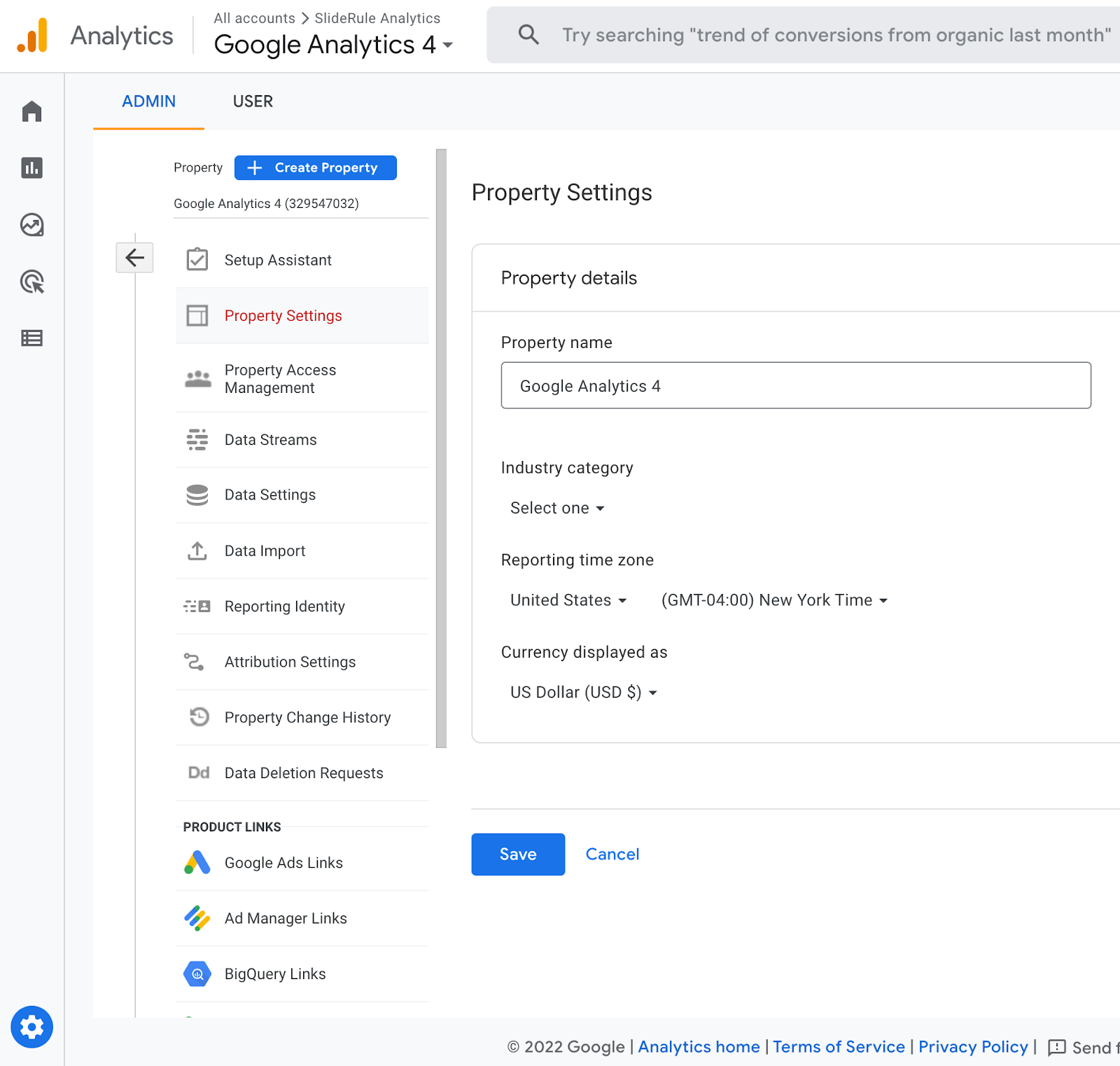In Google Analytics, go to Admin > Property Settings.