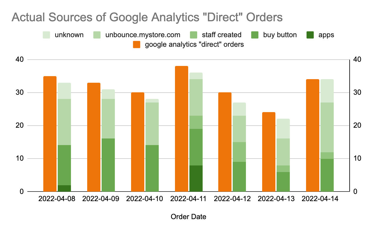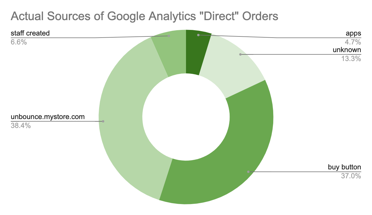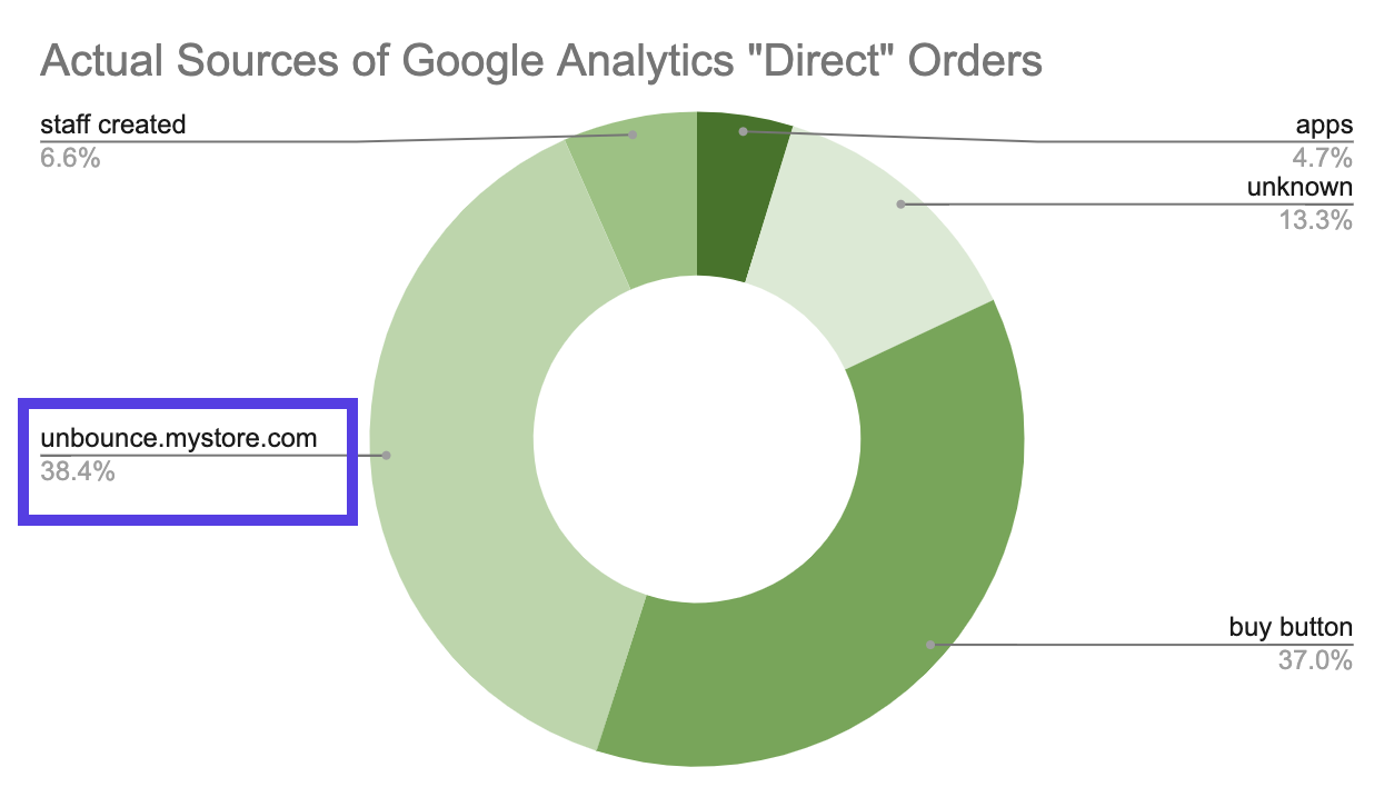 If you use another tool like Unbounce to create and host your landing pages and don’t add Google Analytics to it, all orders from those landing pages will be attributed to direct.